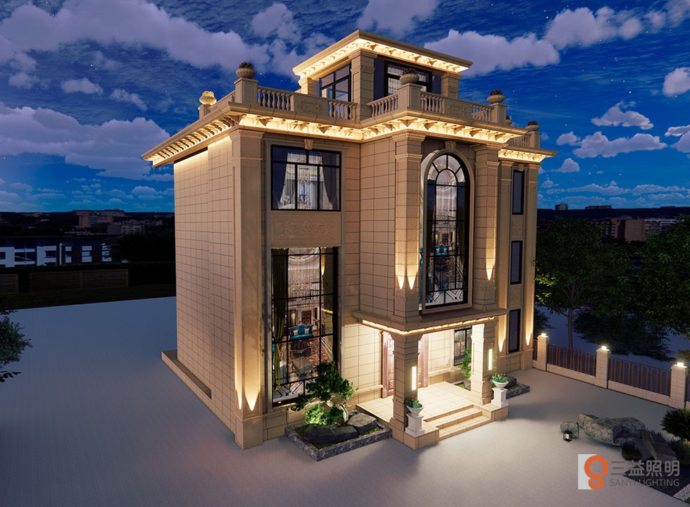 別墅燈光采用3D漫游設(shè)計(jì),燈具采用專業(yè)工程款瓦楞燈、洗墻燈、LED投光燈、定制柱頭燈、壁燈、草坪燈等,整體燈光營造浪漫、溫馨的環(huán)境。
